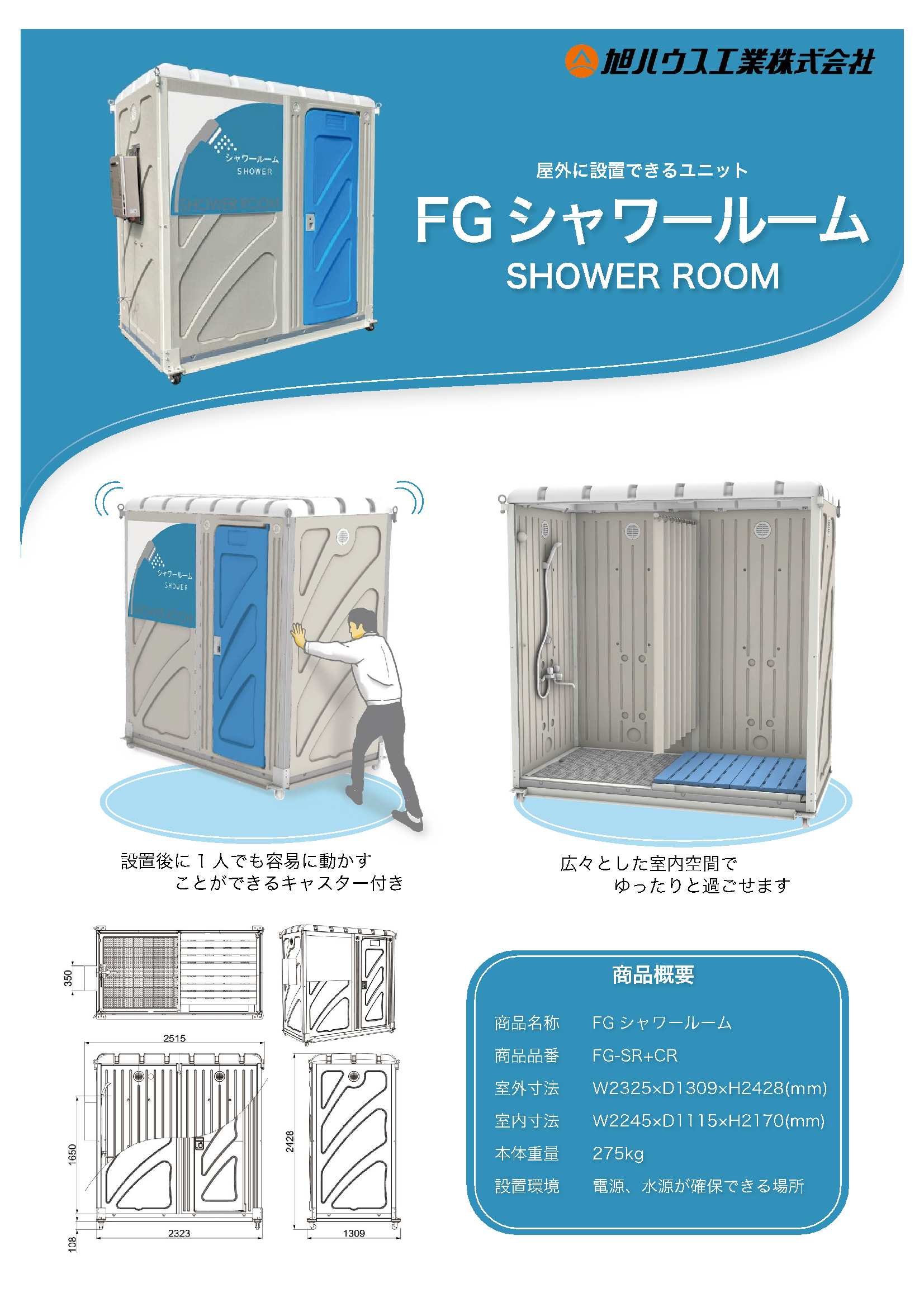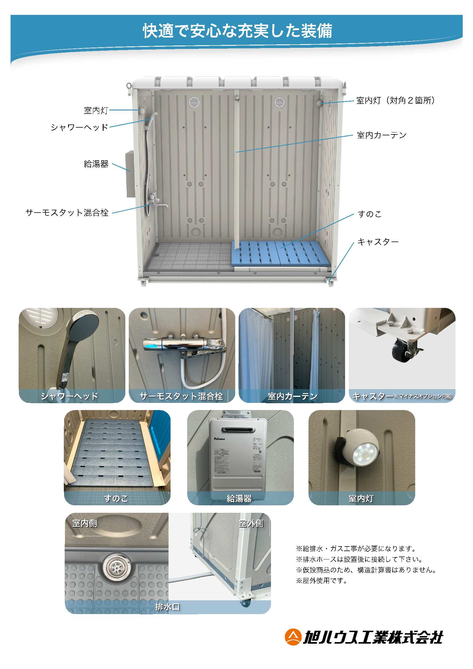 屋外での作業や運動後すぐに汗や汚れを流せる 屋外ユニット FGシャワールーム NEW RELEASE! 衣類の着脱空間にはすのこを敷き、入浴空間とは室内カーテンによって仕切ることができます。 入浴ではサーモススタット付混合栓を採用しているため、好みの温度に調節可能です。 快適な入浴にするため、他にも様々な装備を整えております。 詳細はこちらの商品ページをご確認ください。